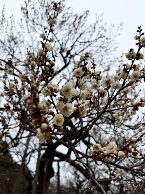曇天の寒い中咲いている梅も